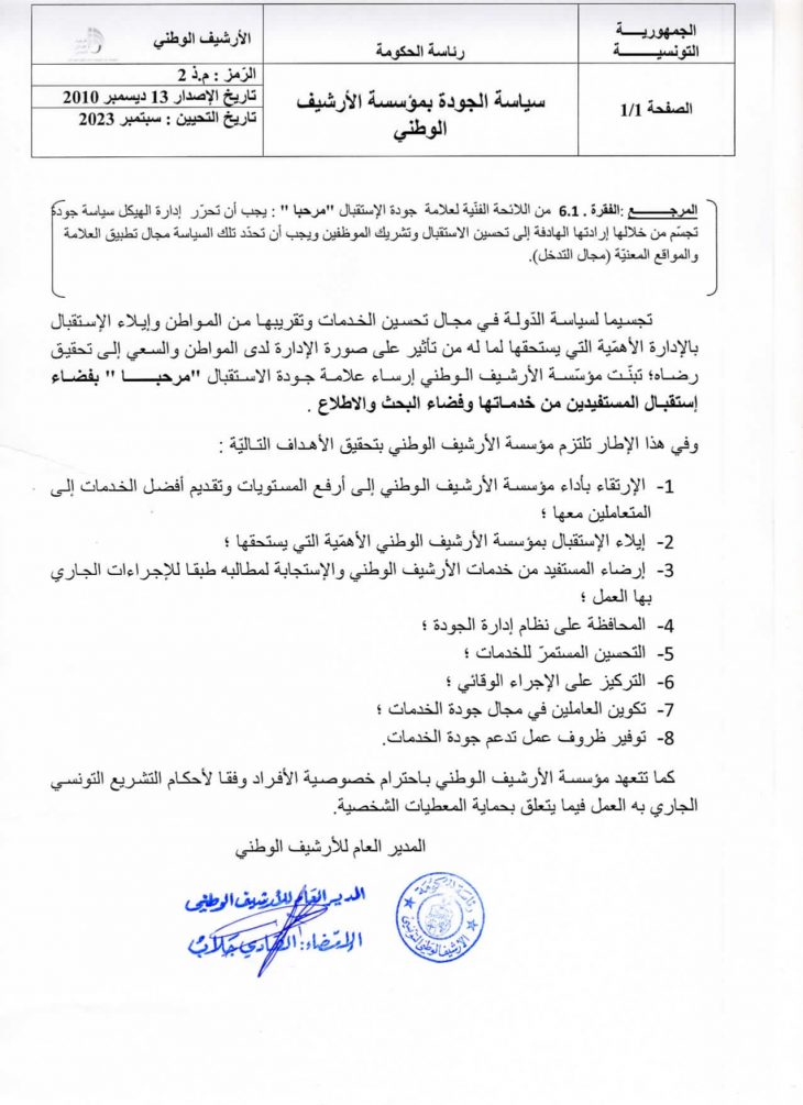 تبنّت مؤسّسة الأرشيف الوطني إرساء علامة جودة الإستقبال “مرحبا” بفضاء إستقبال المستفيدين من خدماتها و فضاء البحث و الاطلاع