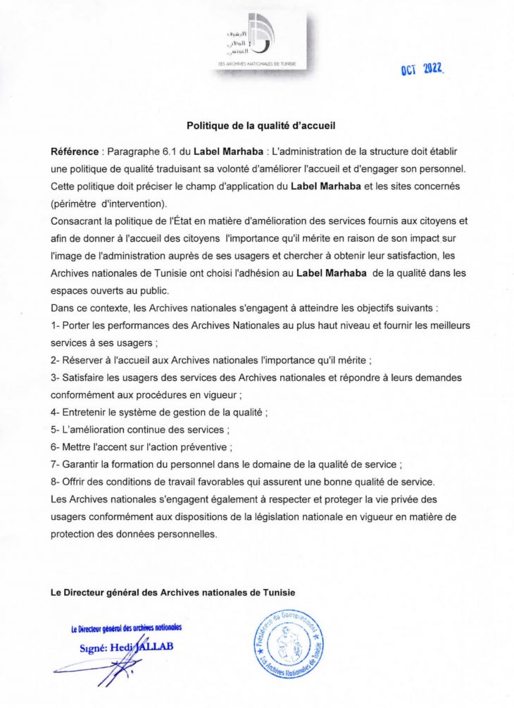 L’Institution des Archives nationales a adopté la mise en place du label de qualité de l’accueil « Marhba » au sein de l’espace d’accueil  ainsi que de l’espace de recherche et de consultation.
